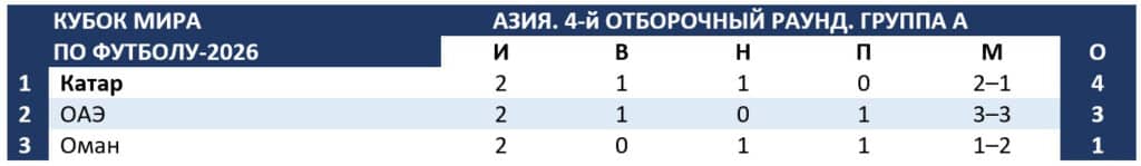 В группе А Катар, сыграв вничью с Оманом 0:0, выиграл у ОАЭ 2:1 (Хухи 49, Педро Мигель 74 – Адиль 90+8). И завоевал вожделенную путевку, поскольку перед этим Эмираты победили Оман – 2:1 (Куадьо 12-а, Кайо 83 – Мелони 77).