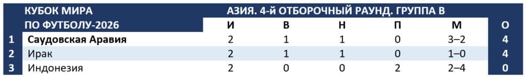 Четвертый раунд азиатского отбора Саудовская Аравия выиграла лишь по лучшей разнице голов. В первой игре хозяева победили Индонезию – 3:2 (Аль-Шамат 17, Албиракан 34-п, 62 – Дикс 11-п, 88-п). Затем индонезийцев с минимальным счетом обыграл Ирак – 1:0 (Икбал 76). А в решающей встрече с иракцами Саудовская Аравия удержала устраивавшую ее нулевую ничью.