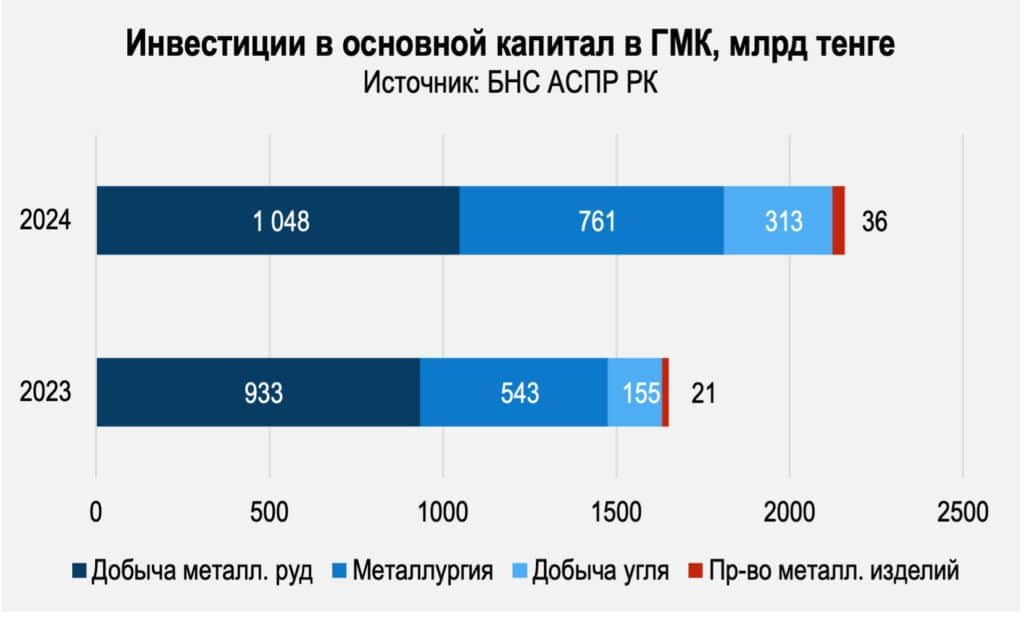 Объем капиталовложений в ГМК почти достиг 2,2 трлн тенге. По расчетам Kursiv Research, это означает впечатляющий реальный прирост в 19,9% за отчетный период, что более чем вдвое превышает рост инвестиций в целом по экономике РК. По размеру капиталовложений лидирует добыча металлических руд: сюда в минувшем году было инвестировано немногим больше 1 трлн тенге, или в реальном выражении на 10,0% выше. В металлургию было вложено 761,4 млрд тенге, с ростом на 37,4% в сопоставимых ценах. При этом самые быстрые темпы показали отрасли, которые традиционно не являются лидерами по объему инвестиций: в угледобычу они выросли до 313,4 млрд тенге (+96,1%), а в производство готовых металлических изделий – до 35,8 млрд тенге (+66,4%).