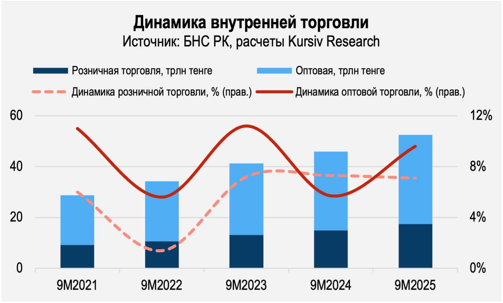 За 9М2025 года торговый сектор Казахстана продолжил демонстрировать заметный рост (оборот достиг 52,8 трлн тенге – на 14,5% выше аналогичного периода прошлого года при росте физического объема предоставляемых услуг на 8,8% г/г), в первую очередь благодаря активной динамике оптовых продаж. В январе–сентябре сегмент оптовой торговли вырос на 9,6% (против 9,8% за январь–август), что может сигнализировать о начале замедления.