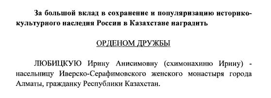 Президент России Владимир Путин наградил орденом Дружбы 100-летнюю монахиню Ирину Любицкую. Она насельница Иверско-Серафимовского женского монастыря в Алматы. Указ опубликован на портале правовой информации.