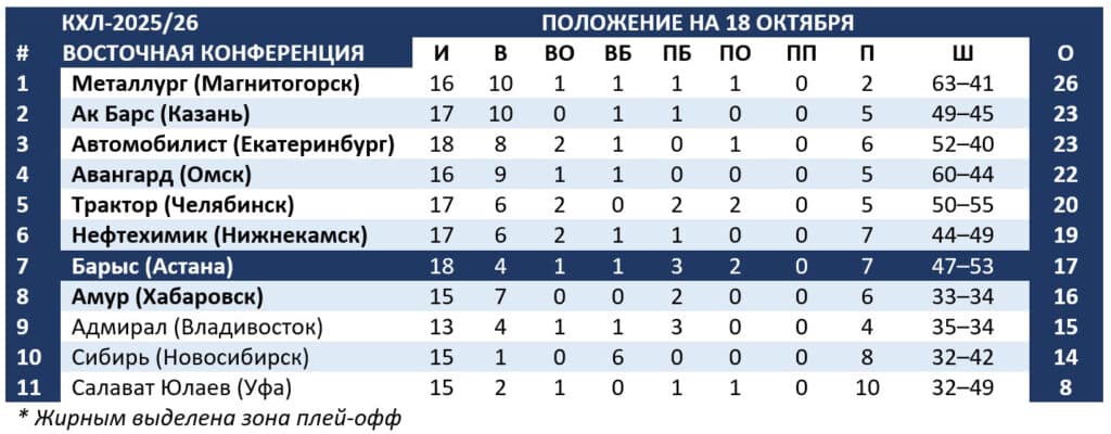 Обидное поражение оставило «Барыс» на седьмом месте с малоприятными перспективами понижения. «Амур», «Адмирал» и «Сибирь» опережают казахстанцев по потерянным очкам.