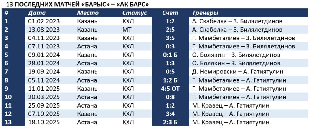 Казанский клуб – один из самых неудобных соперников «Барыса» в КХЛ. За всю историю лиги команда из столицы Татарстана 48 раз побеждала в противостоянии двух «барсов». Казахстанцы только 10. Разница шайб – 103:201. А нынешняя серия фиаско астанчан вообще уникальна – 13 поражений подряд. Включая одно на межсезонном турнире в Казани.