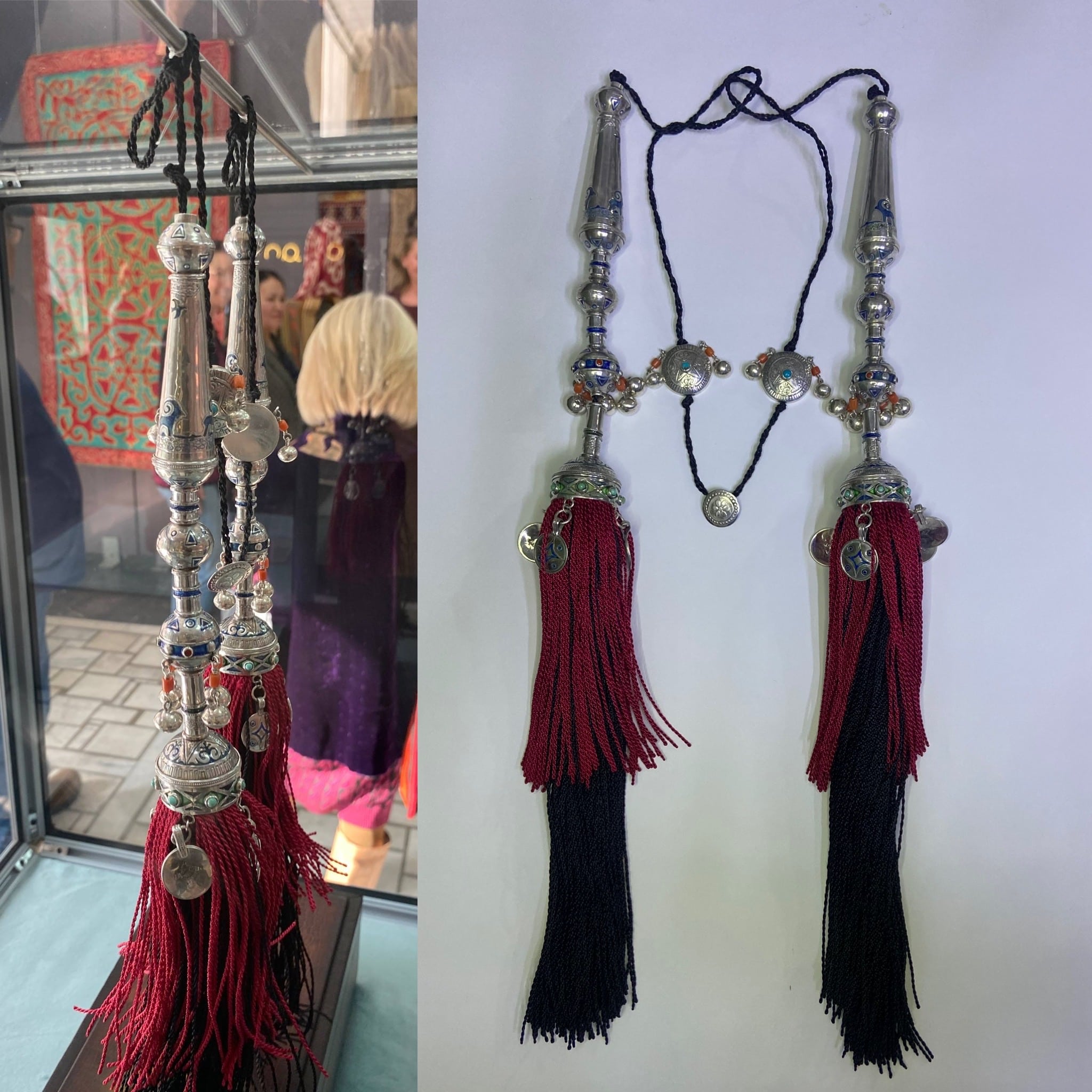 На фоне этих работ, где «микс» старинных техник и современных тенденций, сразу выделяются шашбау – подвески для кос, созданные известным мастером Калмырзой Тасовым. На первый взгляд – классика, причем для всей Центральной Азии: такие украшения были не только у казахов, но и у таджиков, узбеков, кыргызов. Наверное, о таких шашбау писал Абай. Форма, знакомая по музейным каталогам и сайтам: шелковые шнуры с декоративными серебряными элементами, где кораллы, бирюза и эмаль, где традиционный геометрический орнамент и силуэты животных – их тоже хочется разглядывать. И в какой-то момент понять: это очень современное, даже трендовое украшение. «Шашбау моей мечты», – сказала студентка Академии имени Жургенова на открытии выставки.