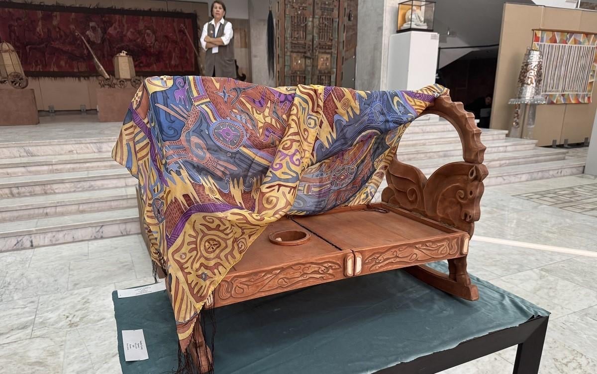 На выставке «Кочевые маршруты. Остановка – Алматы». Колыбель «Лошадь» работы Мадияра Жапабаева, платок работы Гульнар Омирбек. Фото: Гульнар Танкаева