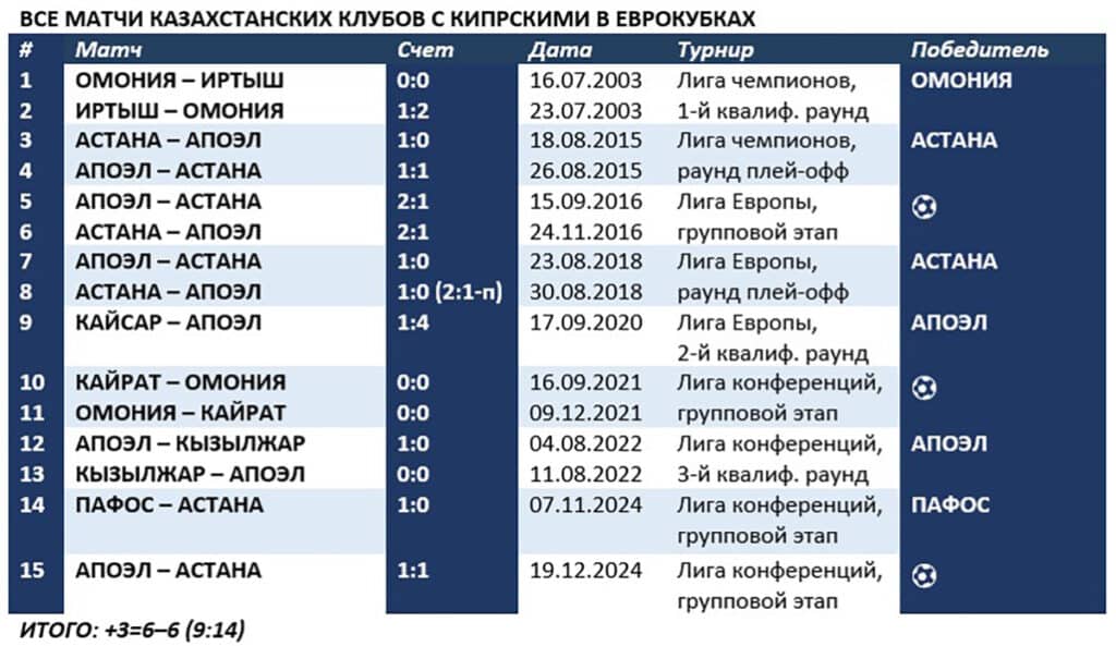 Взаимоотношения казахстанских клубов с кипрскими пока не в нашу пользу. Впрочем, «Кайрат» в этих играх пока не пропустил. Правда, и не забил. Оба матча с «Омонией» в группе Лиги конференций-2021/22 завершились со счетом 0:0.