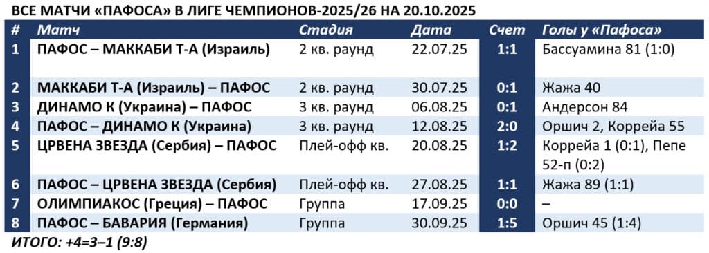 Тем не менее, балл, набранный в Греции, позволил «Пафосу» подняться на 32-е место общей таблицы ЛЧ. «Кайрат» после поражений от «Спортинга» и «Реала» ее замыкает.