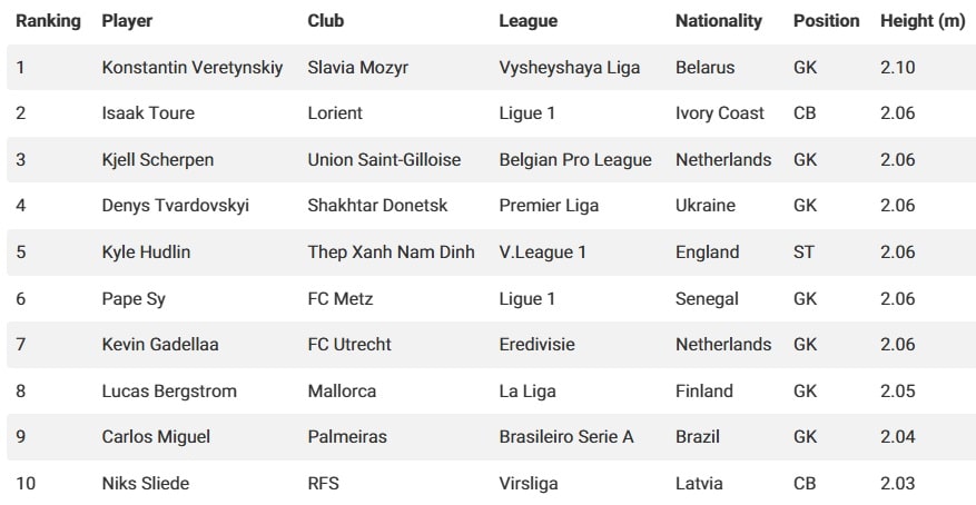 Британское издание GiveMeSport составило список самых высокорослых футболистов планеты. В топ-10 гигантов вошли семь вратарей и три полевых игрока. Рейтинг возглавил белорусский голкипер Константин Веретинский, вымахавший на 2 метра 10 сантиметров.