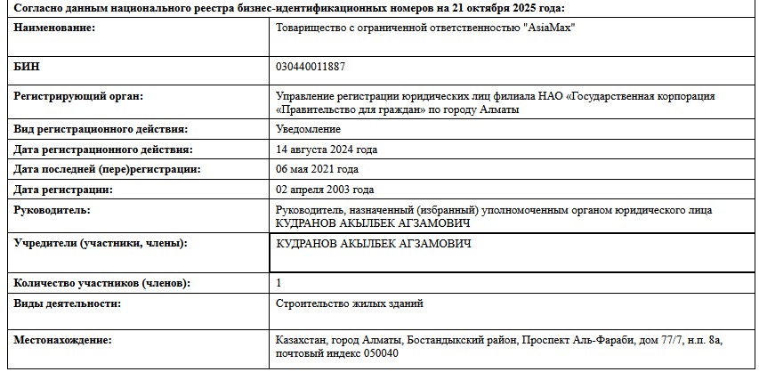 Согласно данным национального реестра бизнес-идентификационных номеров на 21 октября 2025 года, единственным учредителем AsiaMax является Акылбек Кудранов. Он же занимает пост руководителя. Отметим, что основным видом деятельности компании является строительство жилых домов.