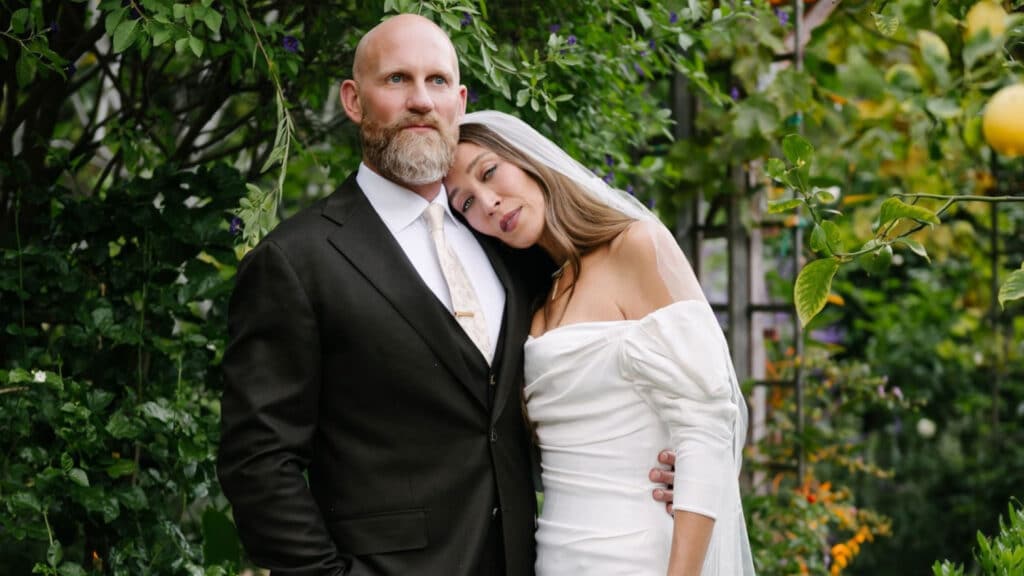Алана выбрала для свадьбы винтажное платье Vivienne Westwood, которое приобрела через бутик редких дизайнерских вещей. Образ дополнила фата с изящной цветочной вышивкой, придающая наряду утонченность и романтичность. Жених преподнес возлюбленной кольцо с аметистом. Украшение является семейной реликвией, которое когда-то принадлежала его матери.