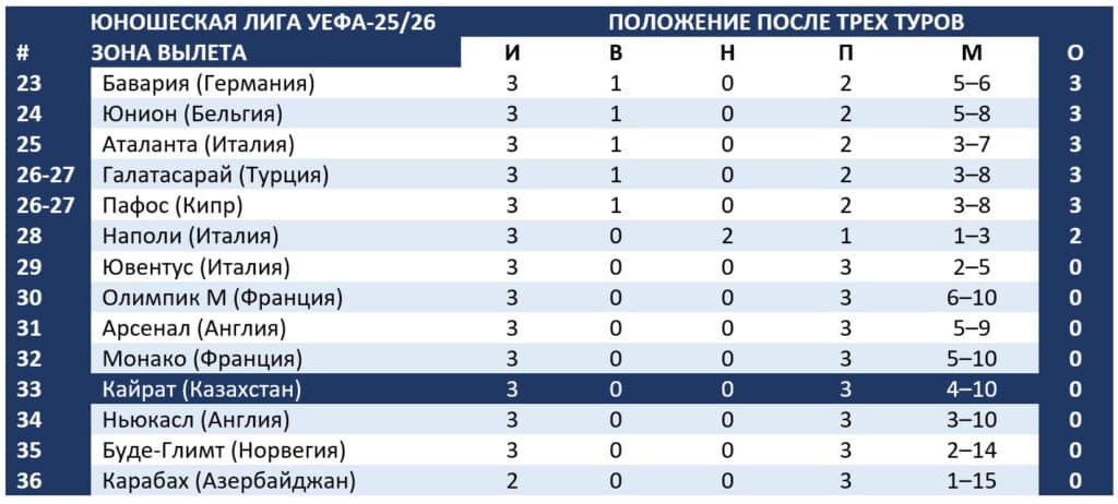 После завершения всех матчей третьего тура Юношеской лиги УЕФА сформировалась общая турнирная таблица. Юноши «Кайрата», впервые принимающие участие в основном турнире, занимают 33-е место из 36-и.