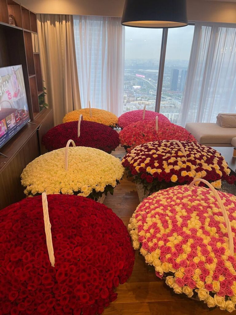 Если предположить, что в каждой корзине по 1001 розе, стоимость такого подарка по московским меркам может достигать 1,8 млн рублей (около 12 млн тенге).