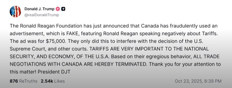 «Фонд Рональда Рейгана только что сообщил, что Канада мошеннически использовала рекламу, в которой Рейган говорит негативно о тарифах. Это фейк. Они сделали это, чтобы вмешаться в решение Верховного суда США. Тарифы очень важны для национальной безопасности и экономики США. Из-за их вопиющего поведения все торговые переговоры с Канадой прекращаются», — написал Трамп в Truth Social.