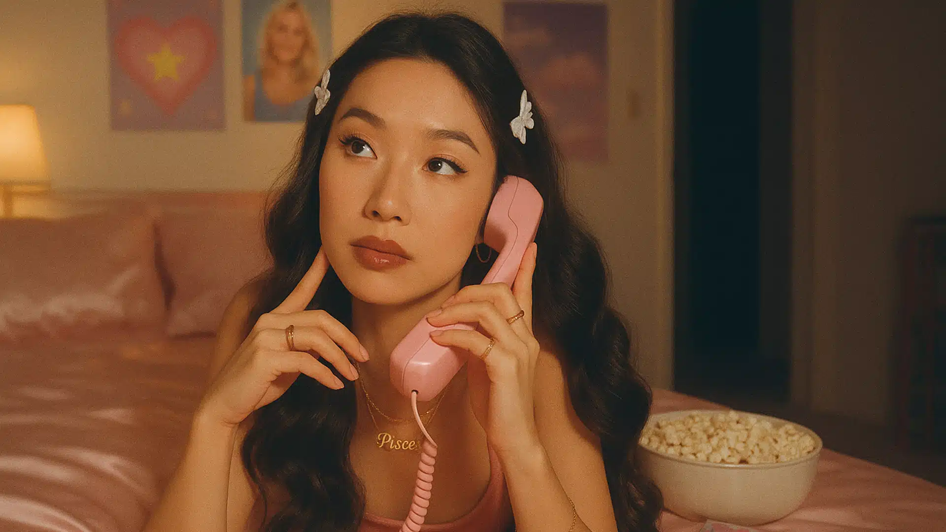 «Create a photo of me in a dreamy y2k style portrait of me laying on a shiny pink satin bedding as i hold a large pink 90s style chorded phone and in a thoughtful daydreaming pose her long hair falls freely in loose curls with white butterfly clips on each side. she wears delicate jewelry including dainty gold necklaces that says «Pisces » and accessories and gold chunky rings. the room behind her is girly and daydreamy with 90s style posters. her makeup is simple yet glamorous with brown lipgloss and brown lip liner. the photo should have a grainy 90s style to it with a light source like a lamp in a dimly lit room at night. a bowl of popcorn rests beside her near some 90s style magazines. the ghostface killer should be behind her staring at her, his body should be dimly lit, and he should be standing in the doorway of a dimly lit hallway. the background behind he should be slightly dark and ominous», — такой промт необходимо отправить вместе со своим фото.