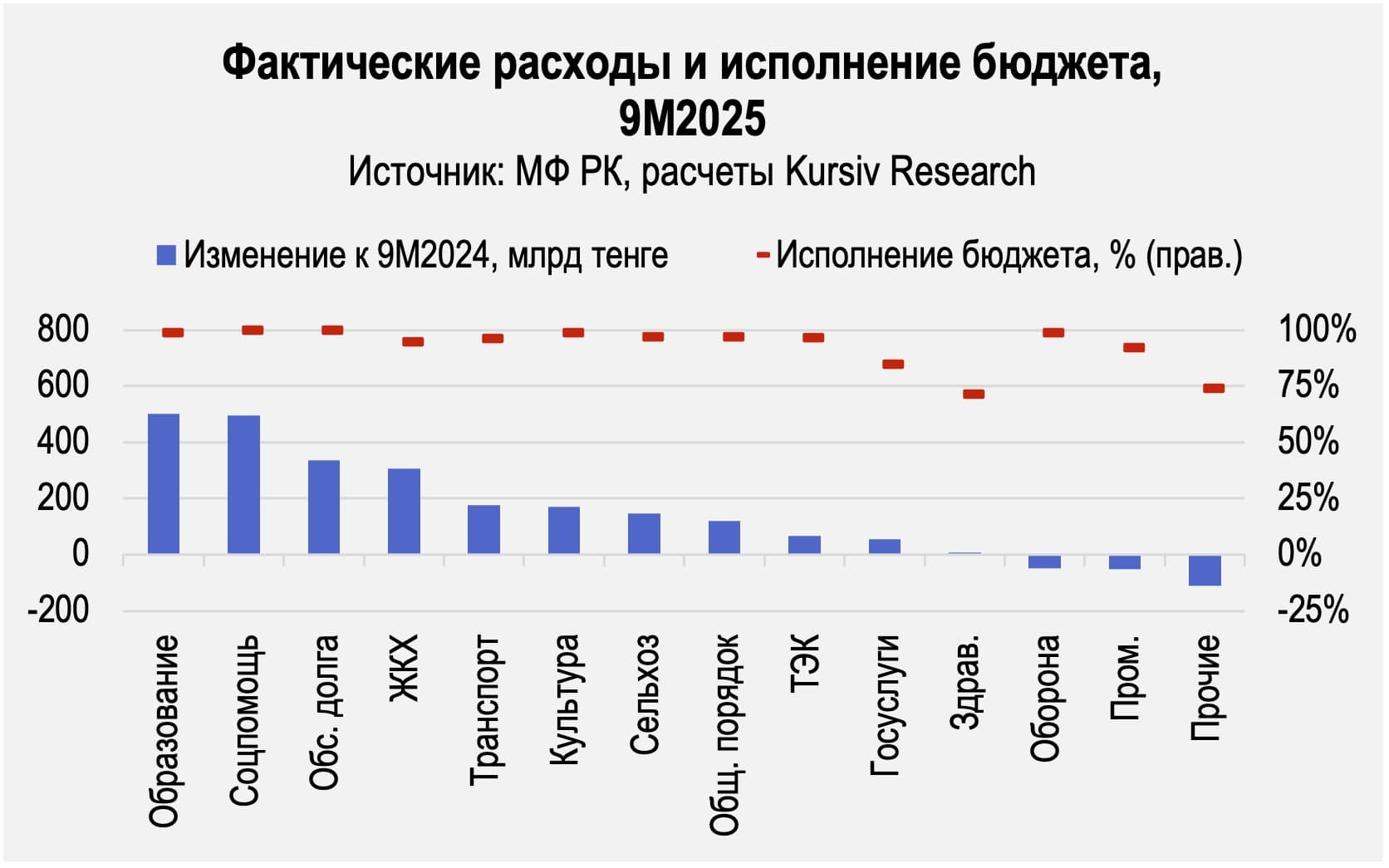 Исполнение расходов бюджета РК за 9М2025 года достигло пятилетнего минимума – 94%. Главные проблемы – неосвоение средств в здравоохранении и по целевым трансфертам. На этом фоне растут траты на обслуживание долга, а новый бюджет 2026–2028 предполагает переход к экономии.