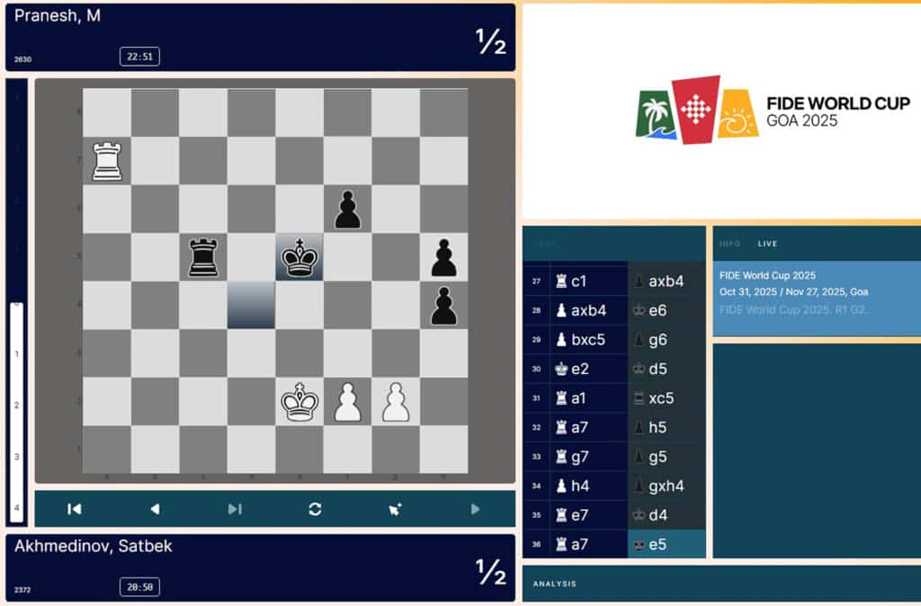 19-летний международный мастер Сатбек Ахмадинов (2372) покинул турнир после ничьей белыми со своим ровесником Пранешем Муринетхинамой (2611).