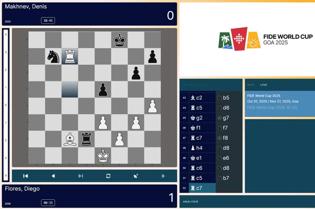 25-летнему Денису Махневу (2525) пойти по пути индуса не удалось. Как ни старался наш гроссмейстер, аргентинец Диего Флорес (2558) взял реванш. Как и в первой партии игра была обоюдоострой. Угрозы 42-летнего южноамериканца пересилили на 52-м ходу.