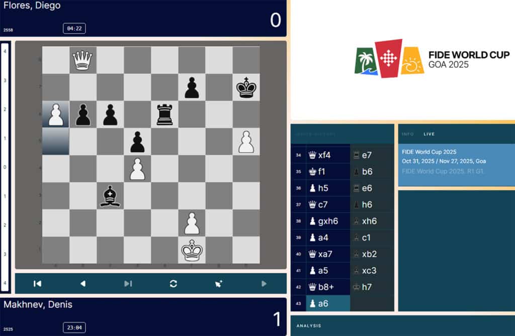 25-летний гроссмейстер Денис Махнев (2525), игравший белыми, на 43-м ходу принял поздравления от Диего Флореса (2558). В обоюдоострой позиции аргентинский гросс увидел неминуемое фиаско.