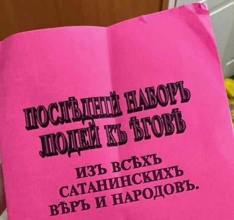 Как сообщил Telegram-канал HALYQSTAN женщина расклеивала ярко-розовые объявления на дверях квартир. Листовки были напечатаны на дореформенном русском языке, что придавало им вид «старинных пророчеств». Надпись гласила: «Послѣдній наборъ людей къ Богу изъ всѣхъ сатанинскихъ вѣръ и народовъ».