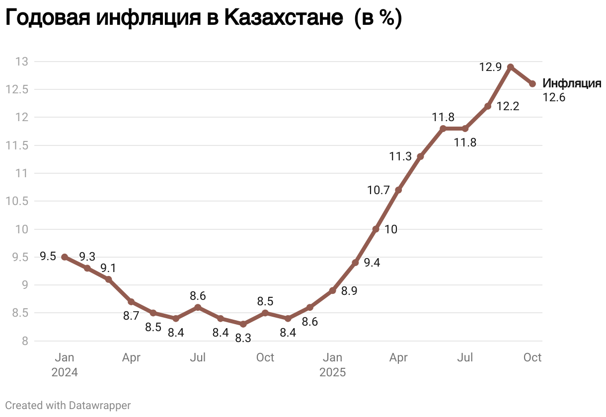 По данным Бюро национальной статистики, годовая инфляция в Казахстане в октябре составила 12,6% после 12,9% в сентябре. Это первое снижение с ноября 2024 года.