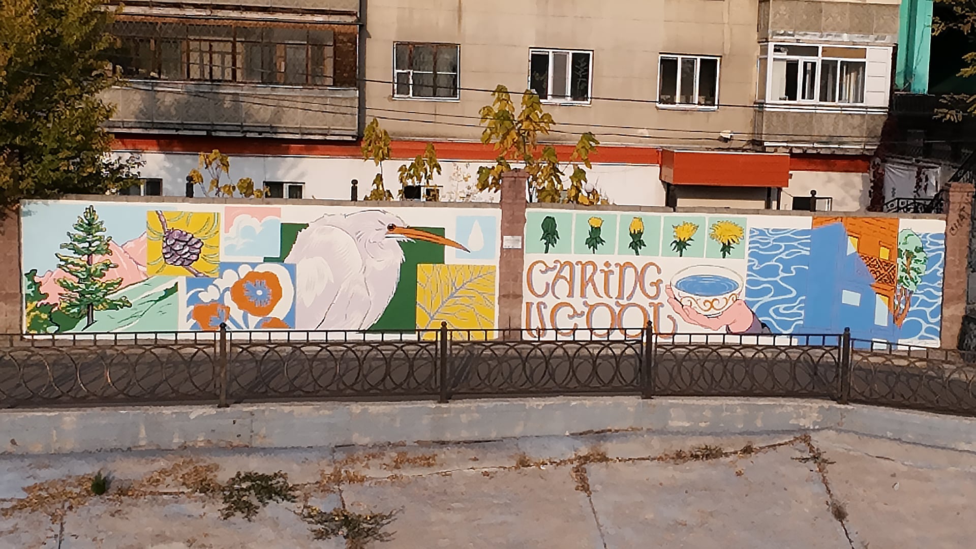 Мурал с названием Caring is cool находится на набережной реки Есентай, чуть выше проспекта Аль-Фараби. Новое украшение города выбирали конкурсом, на который подали заявки 12 авторов. Победил алматинский художник Леонид Чиналиев.