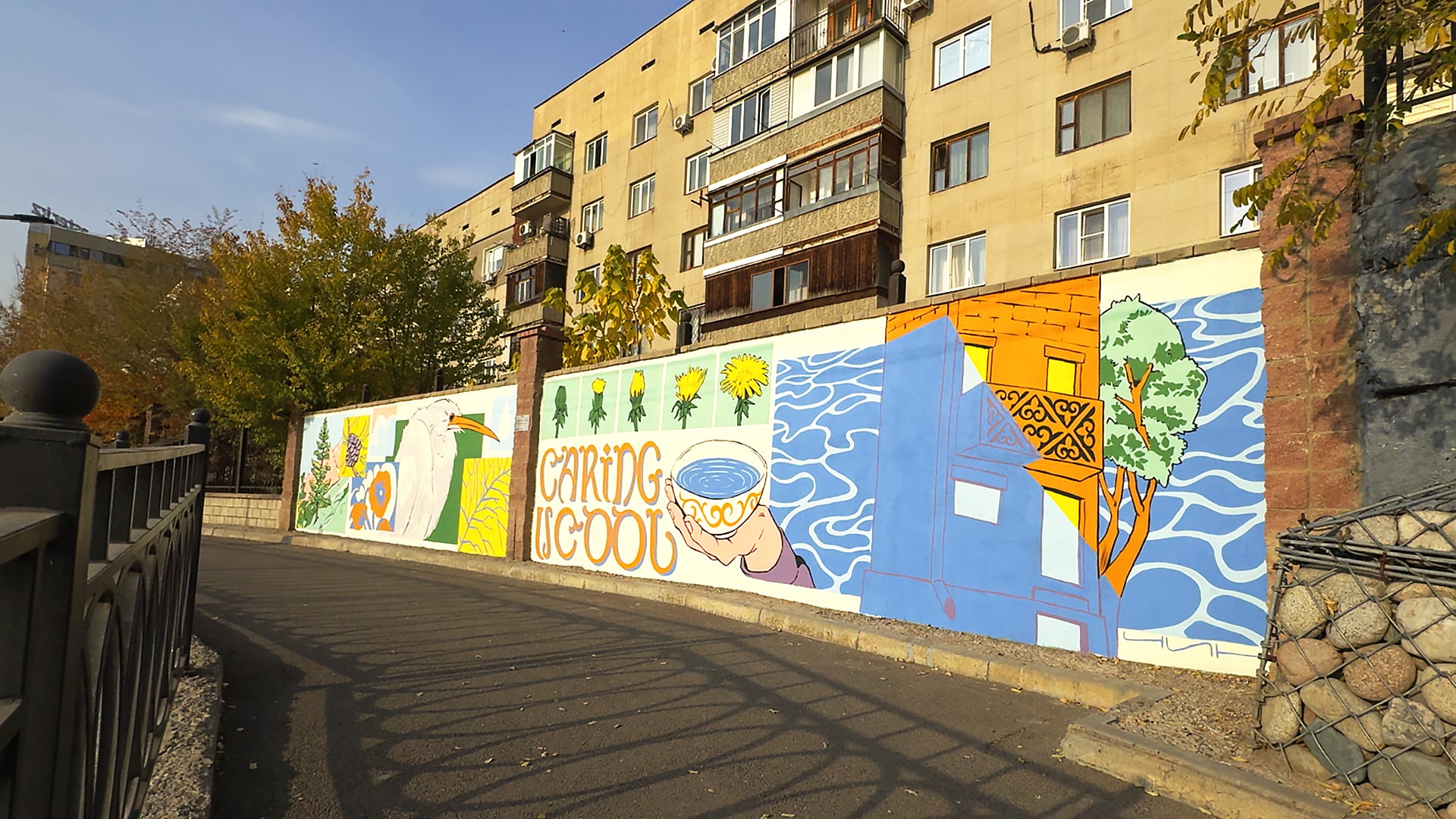 Мурал отсылает к концепции «города-губки», которую урбанисты хотят внедрить в Алматы. Это подход к развитию городов, при котором улицы, парки и здания помогают впитывать и сохранять дождевую воду. Для этого создают зеленые зоны, парки с дренажем, проницаемые тротуары и крыши с растениями. В Алматы подобные проекты пока, к сожалению, находятся лишь на стадии обсуждений.