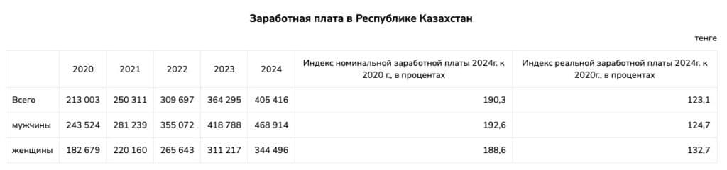 По итогам 2024 года средняя заработная плата в Казахстане составила 405 416 тенге, увеличившись на 11,3% по сравнению с предыдущим годом. В реальном выражении, или с поправкой на инфляцию, рост составил 2,4%, сообщает Бюро национальной статистики.