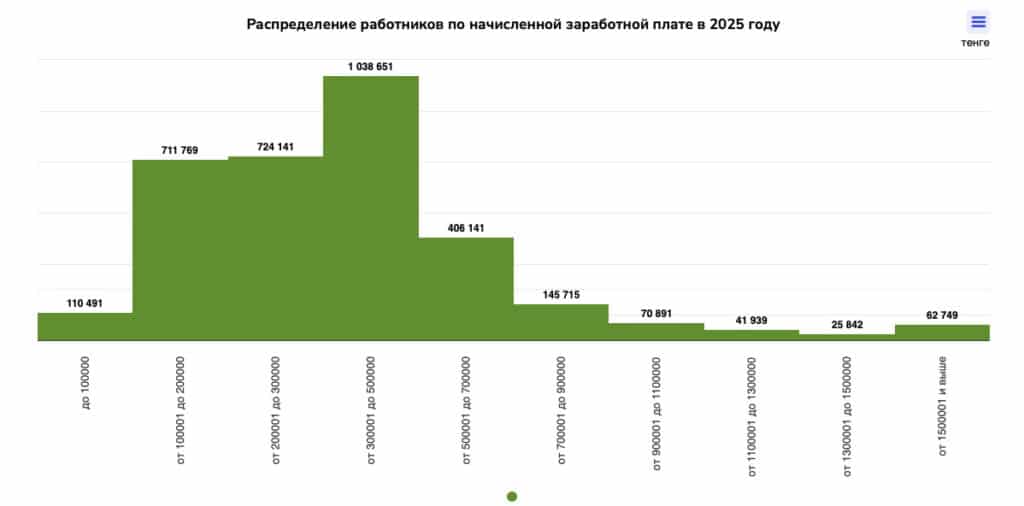 Согласно данным БНС, более половины работников (53,7%) получают свыше 300 тыс. тенге в месяц. У 32,5% зарплата находится в диапазоне 150-300 тыс. тенге, у 10,5% – 100-150 тыс. тенге, и лишь 3,3% зарабатывают менее 100 тыс. тенге.