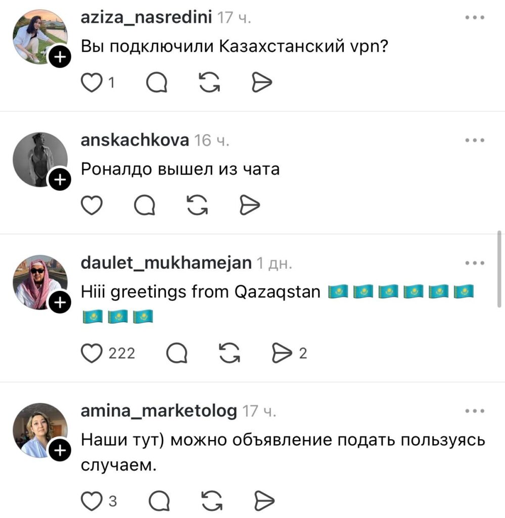 «Почему я, еще не зайдя в коменты, знала, что тут наши?», «Джорджина как пауза между казахстанскими постами», «Ничего себе, здесь пол Казахстана тусуются», «Саламалейкум, Криш, добро пожаловать в казахстанский Тредс», — пишут пользователи.