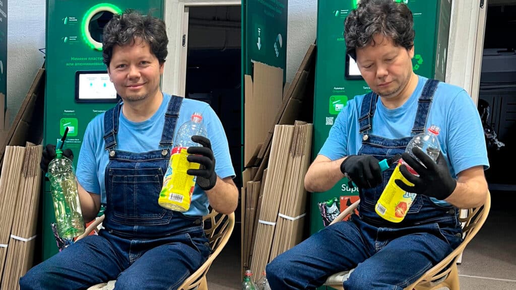 В своем аккаунте в Facebook Евгений Мухамеджанов наглядно показал процесс снятия этикетки с бутылки. Ее срезают канцелярским ножом и только потом отправляют в специальные контейнеры для переработки.