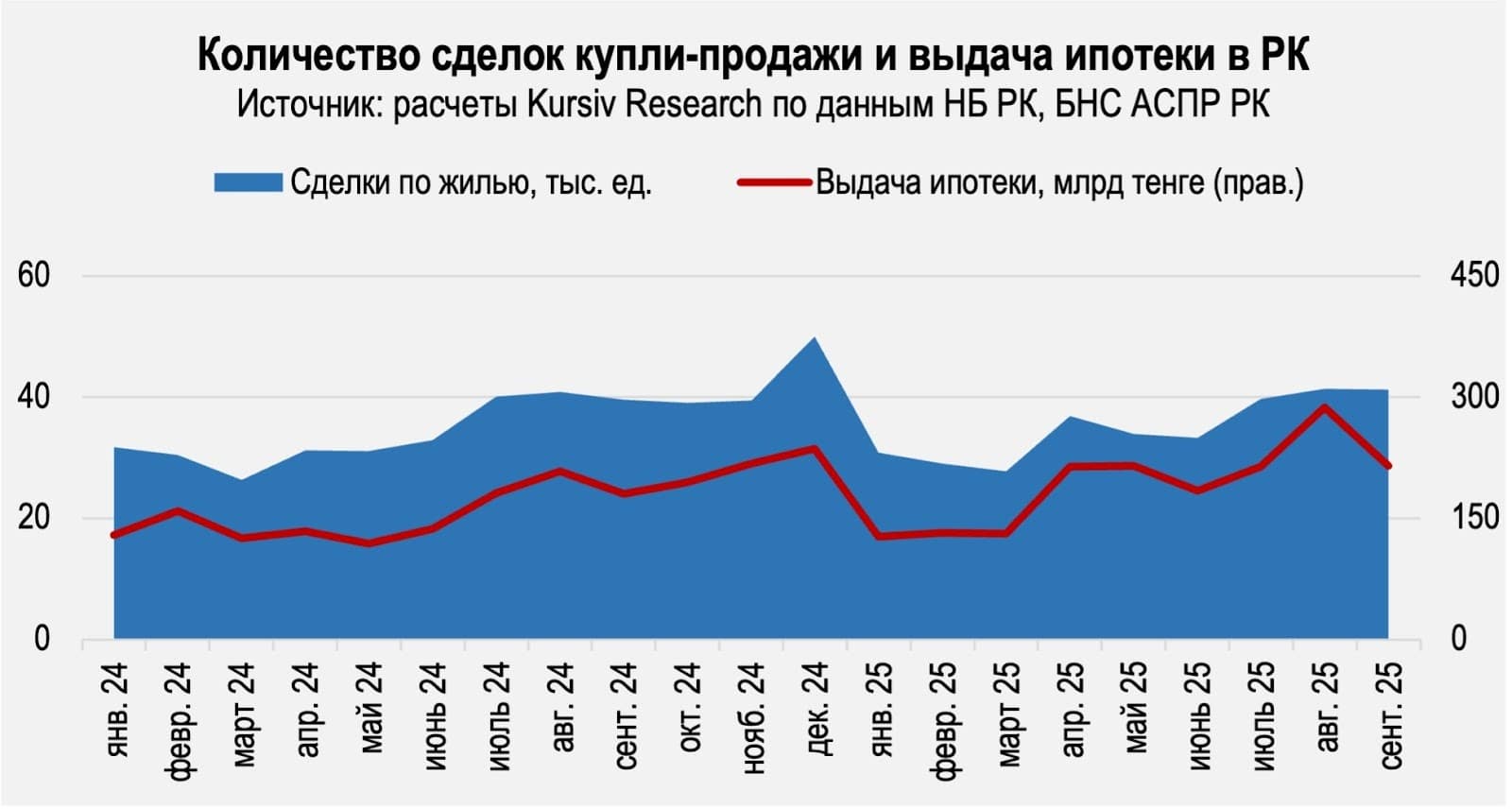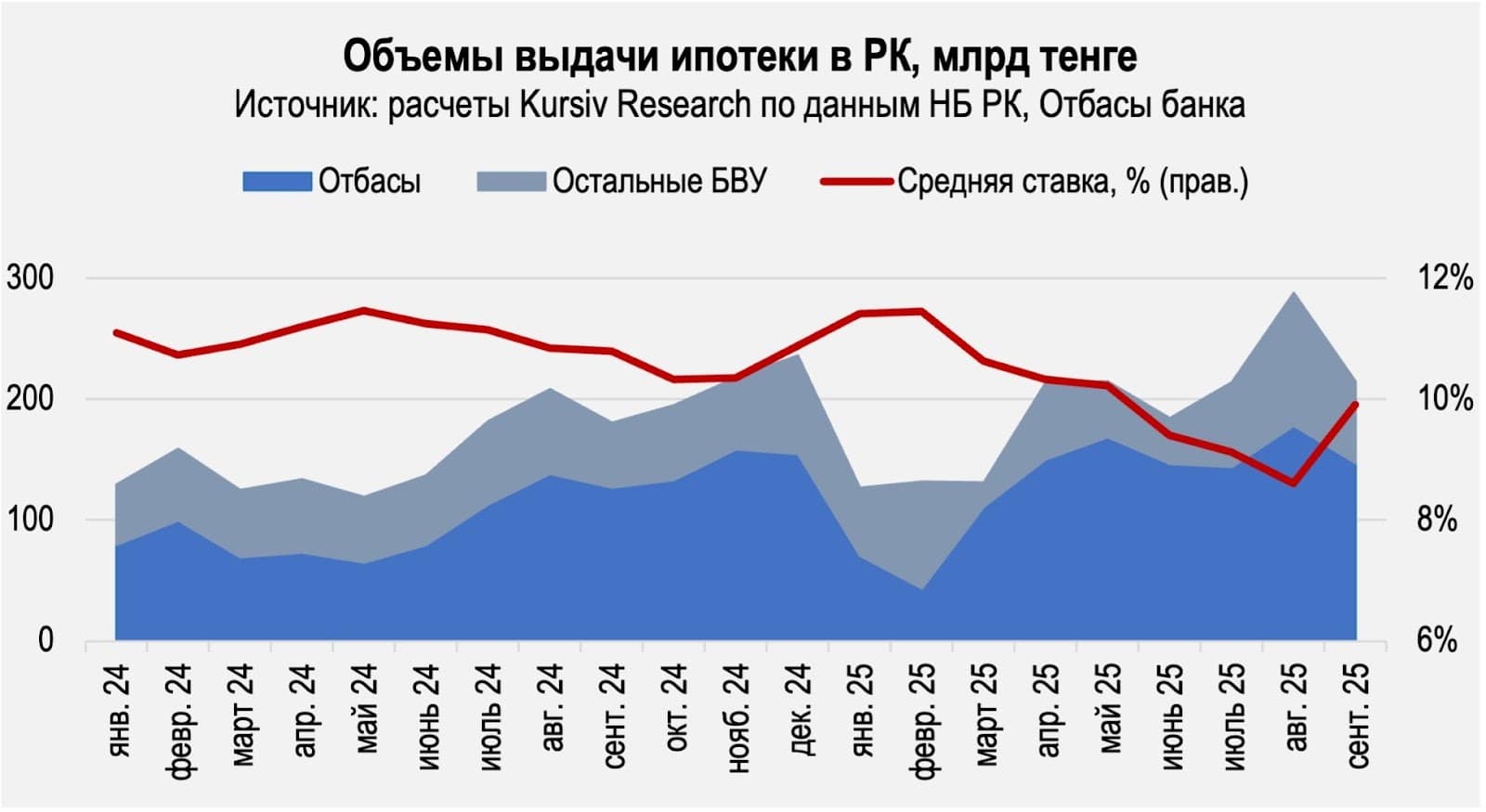 За 9М2025 ипотечный рынок Казахстана восстановился после слабого старта и вышел на траекторию роста: объем новых выдач достиг 1,72 трлн тенге (+25,1% г/г). Это произошло благодаря кратковременному всплеску выдачи в сентябре на 34,7% м/м (Отбасы банк – на 23,7%, а БВУ – на 57,2%) в силу сезонных факторов, новых правил для застройщиков, а также возобновления льготной программы «Наурыз». Однако этот импульс был краткосрочным и в сентябре объемы выдачи вернулись к средним значениям и общая картина не изменилась.