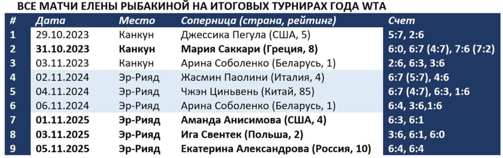 Из участниц WTA Finals Riyadh-2025 (официальное название нынешних соревнования) турнир года выигрывали Свентек (2023) и Гауфф (2024). Действующая чемпионка в прошлогоднем финале победила китаянку Чжэн Циньвень – 3:6, 6:4, 7:6 (7:2).