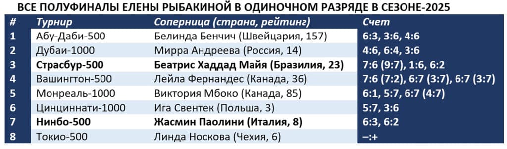 Это будет третий полуфинал Елены в нынешнем сезоне. Любопытная деталь. Если Рыбакина в этом году побеждала в полуфинале, он выигрывала и турнир в целом.