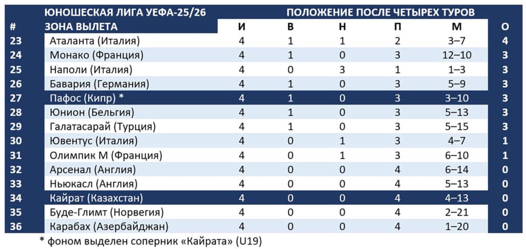 Применительно к нашему «Кайрату» это означают, что подопечные Жоры Арутюняна не сыграют со сверстниками из «Брюгге» и «Арсенала». Алматинским юношам осталось съездить в Копенгаген (26 ноября) и принять «Олимпиакос» (9 декабря).