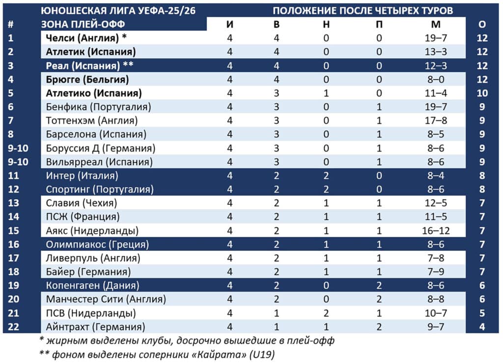 После завершения всех матчей четвертого тура Юношеской лиги УЕФА сформировалась таблица Пути Лиги чемпионов. Пять команд – «Челси», «Атлетик», «Реал», «Брюгге» и «Атлетико» – досрочно обеспечили себе место в 1/16 финала.