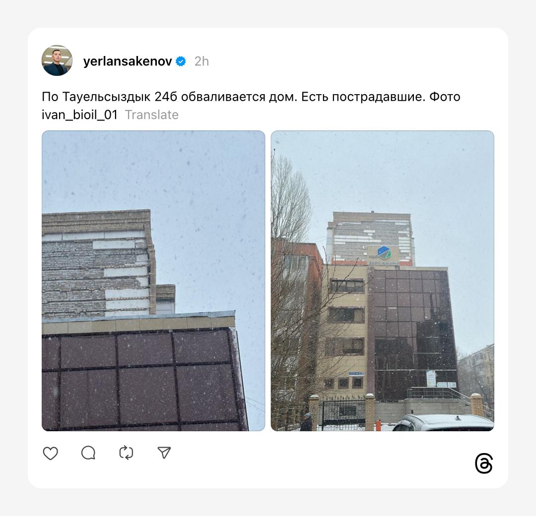 Информация об отваливающемся фасаде здания появилась в соцсетях. Речь шла о жилом доме по адресу Тәуелсіздік, 24Б.