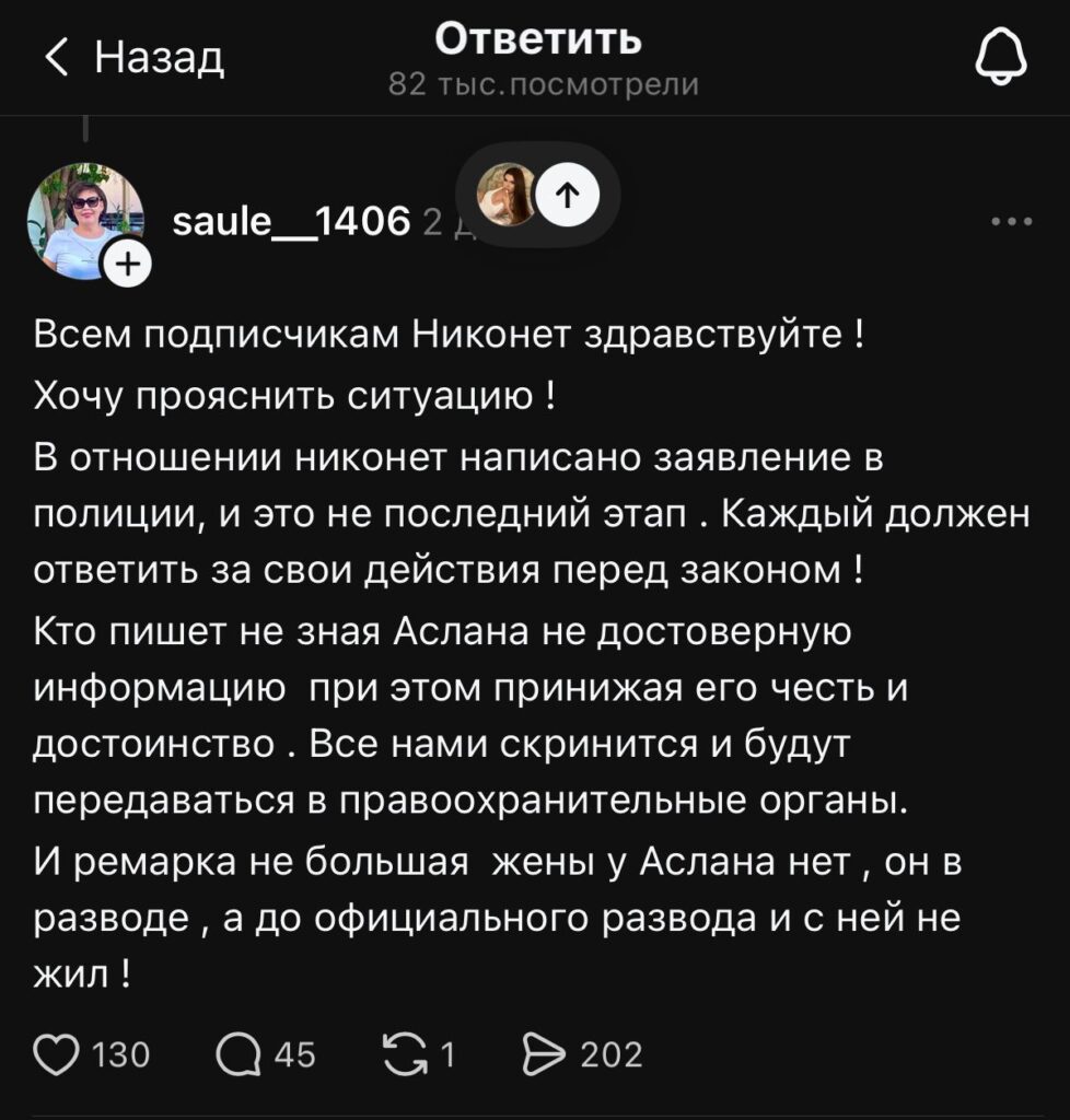 Вскоре ситуация приобрела новое развитие – Ника Турганова сообщила, что мужчина якобы обратился в полицию с заявлением против Тургановой. Также в обсуждения включилась женщина, представившаяся матерью экс-возлюбленного Тургановой.