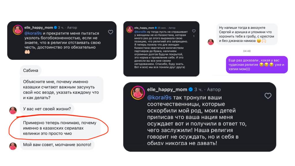 «Вы сейчас не обижайтесь, но в какой момент в Казахстане стало нормой выходить не то что нецеломудренной, так еще и беременной? Вы же мусульмане! Такое есть среди всех, да, но будто это просто на потоке и норма у вас. Хоть постыдитесь, скрывайте свой грех. Весь директ, опросник в таком постоянно. Береги честь смолоду и не будет необходимости голову ломать, как поступить», — написала казахстанке блогер.