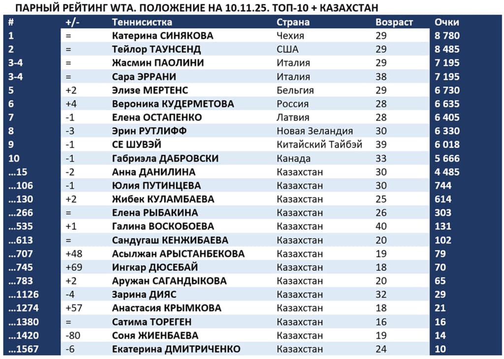 Результаты парного турнира в Эр-Рияде оказались не в пользу Анны Данилиной. Дошедшие до финала Тимя Бабош (15) из Венгрии и Луиза Стефани (16) из Бразилии отодвинули 30-летнюю казахстанку с 13-го места рейтинга на 15-е место. 32-летняя партнерша Анны Александра Крунич из Сербии, вместе с которой Данилина стала вице-чемпионкой «Ролан Гаррос-2025», завершила сезон 17-й.