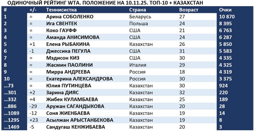 Высшая позиция в рейтинге другой казахстанки Юлии Путинцевой (20) датируется январем нынешнего года. За сезон 30-летняя теннисистка опустилась на 73-е место.