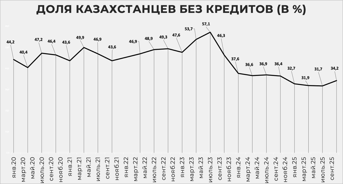 Компания FusionLab по заказу Нацбанка провела очередной опрос среди 1500 казахстанцев. В октябре 34,2% респондентов заявили, что не имеют кредитов – это один из самых низких показателей за последние пять лет.