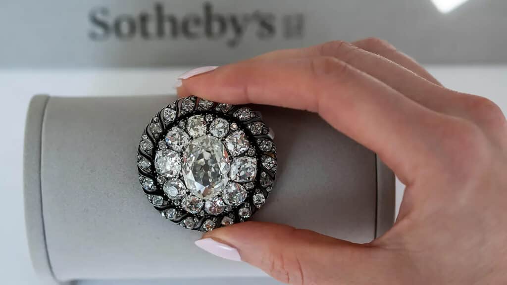 Украшение с овальным бриллиантом весом более 13 карат и россыпью мелких камней стоило в десятки раз дороже ожидаемого – начальная оценка составляла всего 251,4 тысячи долларов.