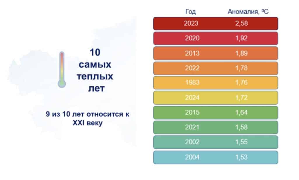 Среднегодовая температура оказалась выше климатической нормы на +1,72 °C, а на отдельных метеостанциях фиксировались экстремальные отклонения до +3,3 °C. В результате летний период выдался особенно жарким: на большей части территории страны воздух стабильно прогревался выше +30 °C, а в некоторых местах — до +35 °C.
