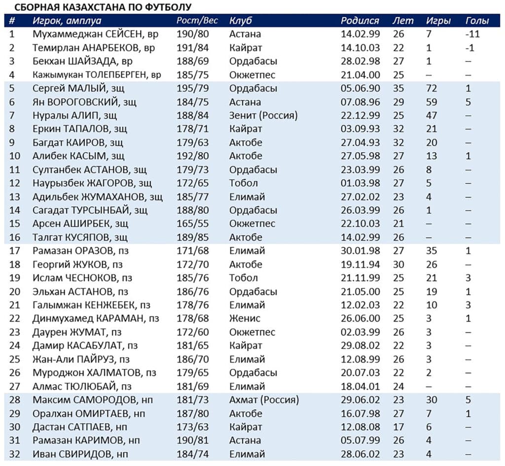 После той катастрофы Али Алиева у руля сборной Казахстана сменил Талгат Байсуфинов. Под его руководством наши парни разгромили Лихтенштейн (4:0) и едва не победили в Скопье (1:1). Исполняющий обязанности главного тренера из первоначального «списка 38-и» оставил в своем распоряжении 32-х. Как ни жаль, среди них нет Бактиера Зайнутдинова и Исламбека Куата, перебравших горчичников.