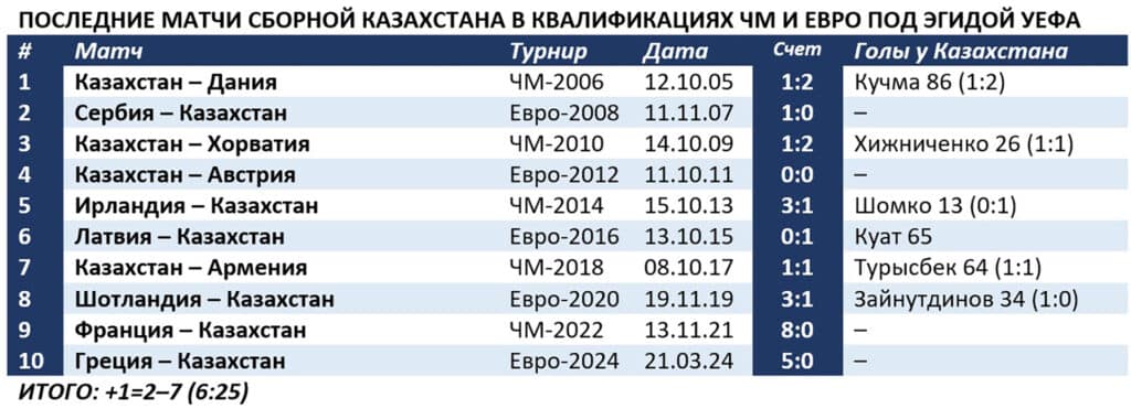 Заключительные матчи отборочных циклов чемпионатов мира и Европы казахстанцы чаще проигрывали. Последние два, с Францией и Грецией, с общим счетом 0:13. В игре с «трехцветными», к слову, нашей сборной руководил Байсуфинов. Так что печальный опыт у него имеется. И выводы опытный наставник, хочется верить, сделал.