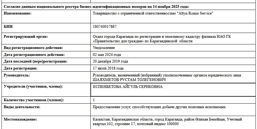 ТОО Altyn Komir Service зарегистрировано 17 июля 2018 года. На данный момент единственным учредителем компании является Айгуль Еспенбетова. Возглавляет предприятие — Рустам Шаяхметов.