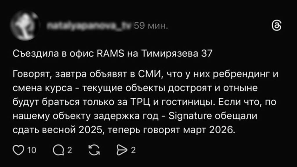 Ранее внимание алматинцев привлекло то, что название RAMS исчезло с вывесок отдельных ЖК, а официальные аккаунты компании в соцсетях стали недоступны. Это вызвало обсуждения и предположения среди дольщиков и пользователей соцсетей.