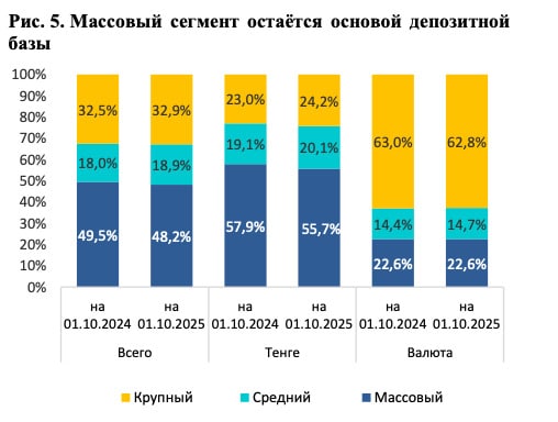 Массовый сегмент (депозиты до 15 млн тенге) по-прежнему остается основой рынка с долей 48,2% по совокупному депозитному портфелю и 55,7% по депозитам в национальной валюте.