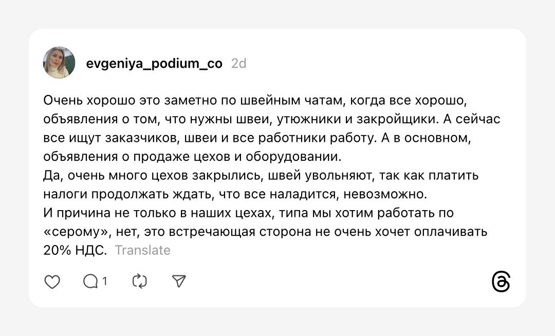 Серия бурных обсуждений началась с поста блогера Ростислава Ященко. По словам мужчины, в швейном бизнесе наблюдается большой кризис.