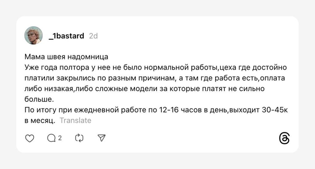 Кроме того, многие комментаторы рассказали об условиях работы кыргызстанских швей. По их словам, из-за закрытия многих цехов работницам приходится идти на низкооплачиваемую работу с рабочим днем по 10-12 часов.